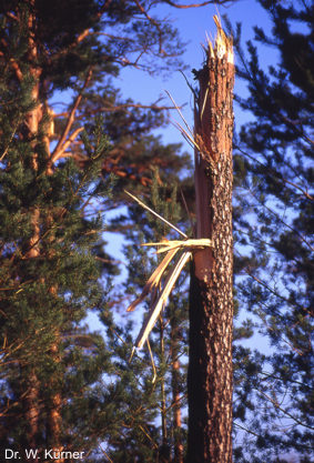 Bäume mit einem Brusthöhendurchmesser (BHD) >30 cm, deren Wipfel abgebrochen ist sollten erhalten bleiben, sofern die Wegesicherung nicht entgegensteht. Die senkrecht stehenden Baumstümpfe sind potenzielle Höhlenbäume für Spechte und Höhlennachnutzer (Fledermäuse, Kleineulen usw.) sowie Lebensstätte