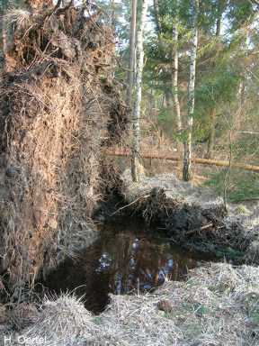 Durch Umstürzen von Bäumen können bei entsprechendem Grundwasserstand Wurzelkolke entstehen. Sie bilden natürliche Kleingewässer, die ein Gebiet in seiner Biotopstruktur erheblich aufwerten können. Durch Belassen dieser natürlich entstandenen Tümpel kann das Habitatangebot für